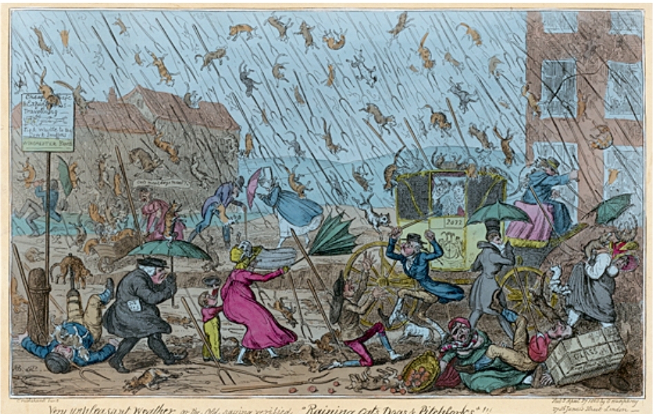 What is the origin of the phrase “it’s raining cats and dogs?”